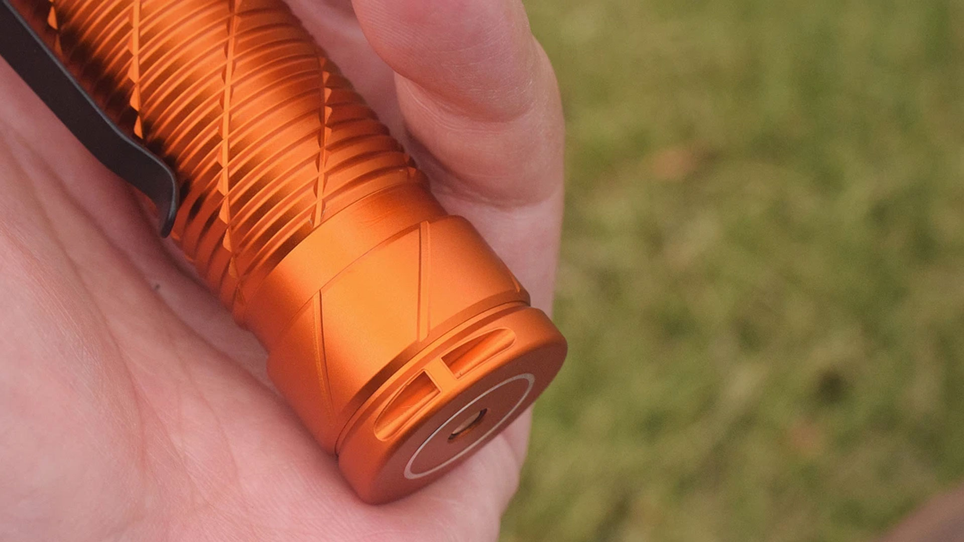 Il pulsante laterale ha anche un indicatore di batteria a tre colori (verde, giallo, rosso), che sostituisce il motorino vibrante utilizzato sulla Perun 2 per segnalare la batteria scarica. Questo indicatore rende la lettura dello stato della batteria più semplice e intuitiva. La logica del pulsante rimane semplice: una pressione veloce per accendere e spegnere, una pressione lunga di 2 secondi per attivare la modalità Firefly e tenendo premuto è possibile bloccare il pulsante (la spia lampeggia una volta per confermare il blocco). In modalità on, un doppio clic attiva la modalità Turbo, mentre un triplo clic attiva la modalità strobo. Una pressione prolungata consente di scorrere i diversi livelli di luminosità.