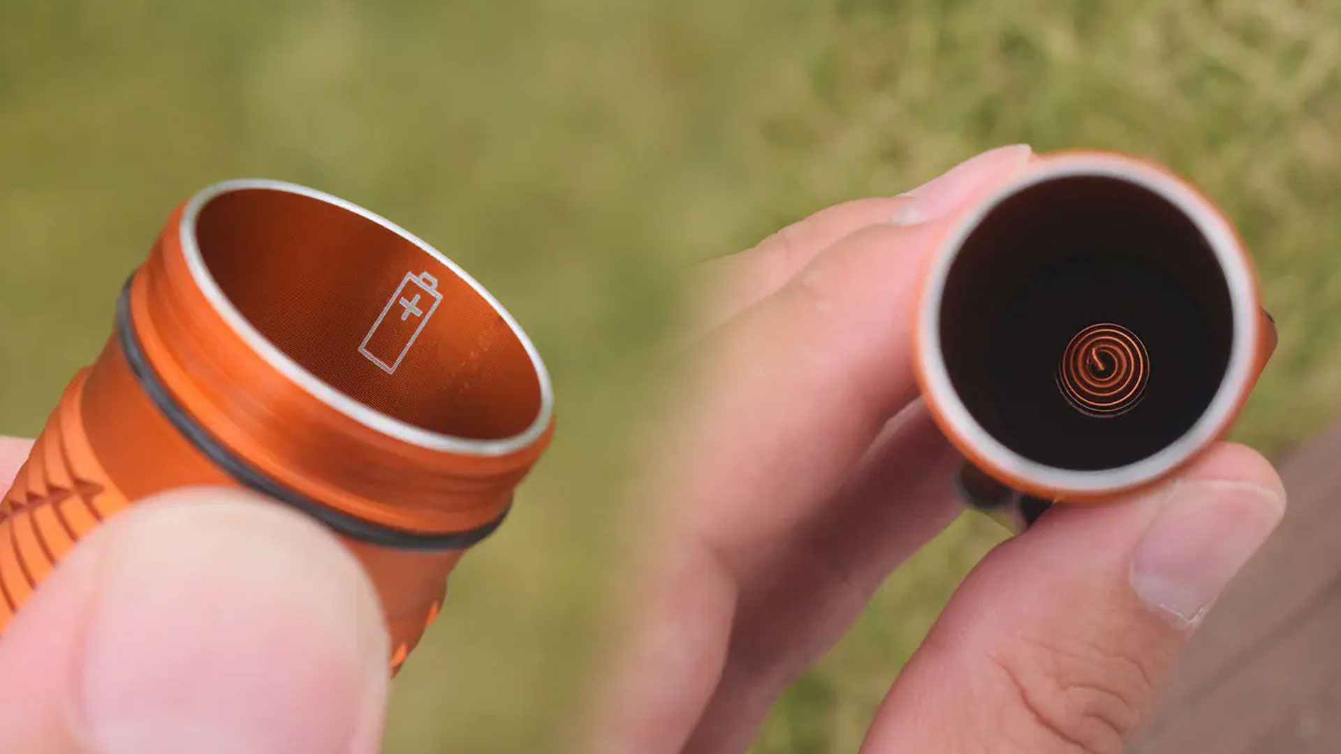 Svitando il tappo posteriore è possibile vedere i contatti placcati oro all'interno. Il tubo della lampada è inoltre contrassegnato con indicazioni di polarità positiva e negativa per evitare eventuali errori durante l'inserimento della batteria.