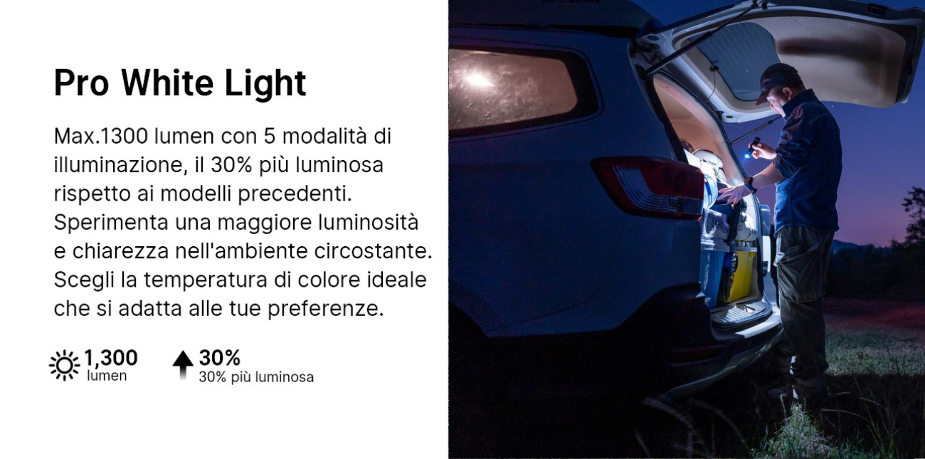 Nel cuore della Arkfeld Pro si trova un LED ad alte prestazioni che offre un'eccezionale luminosità massima di 1300 lumen. Questa incredibile resa ti assicura che non rimarrai mai al buio, non importa quanto siano difficili le condizioni di illuminazione.