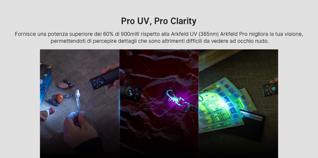 Per ultimo, ma non meno importante, l'Arkfeld Pro vanta un'impressionante modalità luce UV che porta la sua versatilità a nuovi livelli. Con un'emissione ad alta potenza fino a 900 mW a una lunghezza d'onda di 365 nm, questa luce UV offre un'esperienza più perfetta e professionale rispettoalle luci UV standard da 395 nm.
