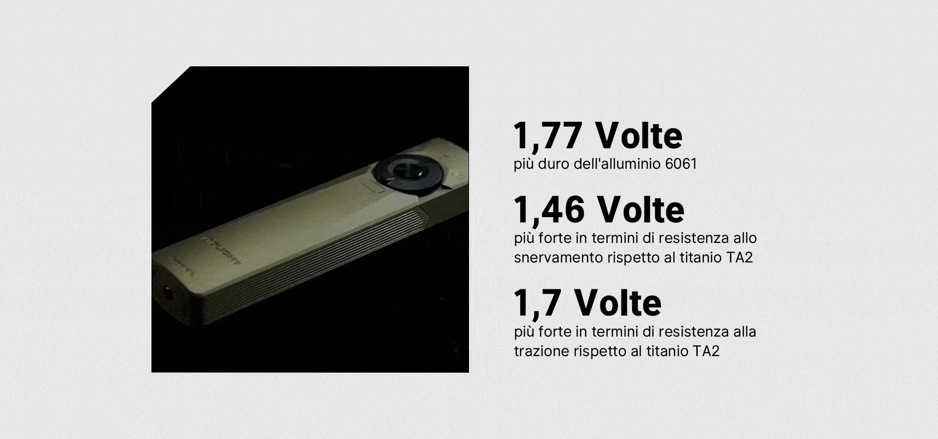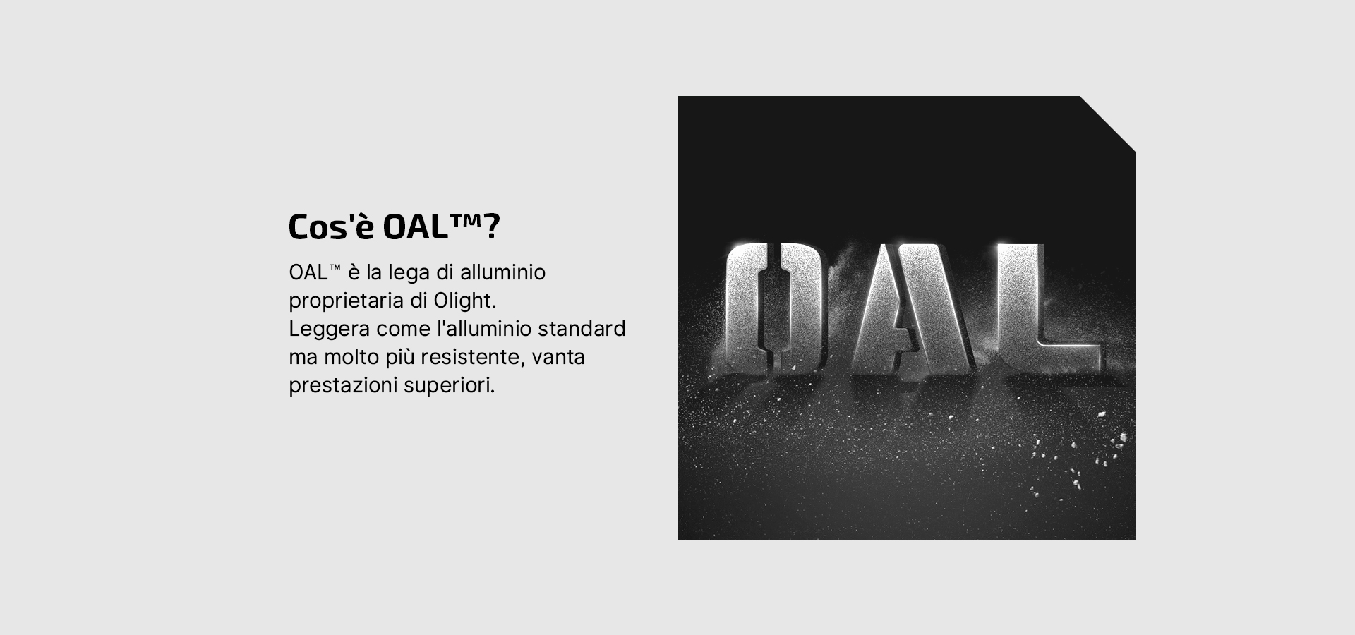 L'alluminio è la lega di alluminio proprietaria di Olight. Leggero come l'alluminio standard ma molto più resistente, vanta prestazioni superiori.