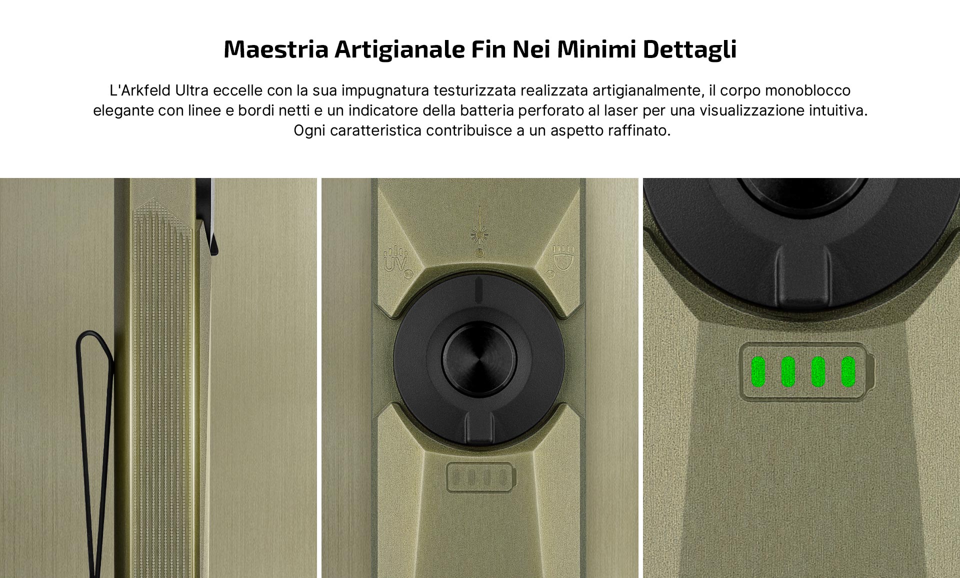 L'Arkfeld Ultra eccelle con la sua impugnatura texturizzata realizzata artigianalmente, il corpo monoblocco elegante con linee e bordi chiari e un indicatore della batteria perforato al laser per una visualizzazione intuitiva. Ogni caratteristica contribuisce a un aspetto raffinato.