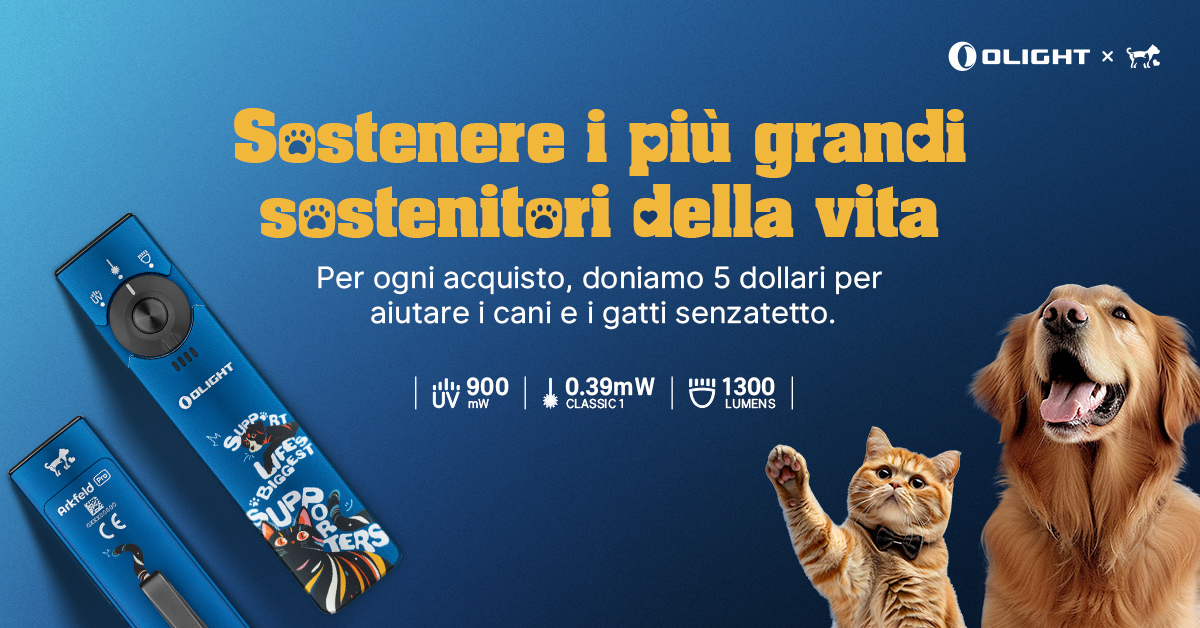 Illumina il tuo cammino, illumina una vita! Con ogni acquisto di Arkfeld Pro Paw Edition da Olight, 5 $ vengono donati per supportare cani e gatti senza casa, rendendo questa straordinaria torcia elettrica un faro di speranza per i nostri amici pelosi bisognosi. Arkfeld Pro Paw Edition presenta graziosi motivi animali, rendendolo un accessorio delizioso per gli amanti degli animali di tutte le età. 1300 lm Si illuminano quando si porta a spasso il cane di notte per metterli al sicuro. Usa la luce UV per trovare i batteri sul corpo del cucciolo e mantenerlo sano. Gioca con il cucciolo con il laser verde per renderlo felice. Illumina la tua parola, illumina il mondo degli animali Olight è in viaggio.