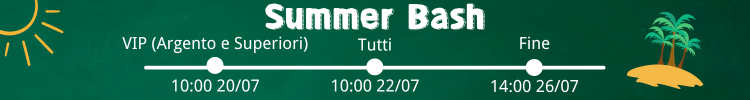 I membri VIP (Argento e superiori) hanno accesso anticipato alla vendita a partire dalle 10:00 del 20/07/2024. Per tutti i clienti la vendita aprirà alle ore 10:00 del 22/07/2024 e durerà fino alle ore 14:00 del 26/07/2024. Assicurati di segnare sul tuo calendario il nostro prossimo Summer Bash!