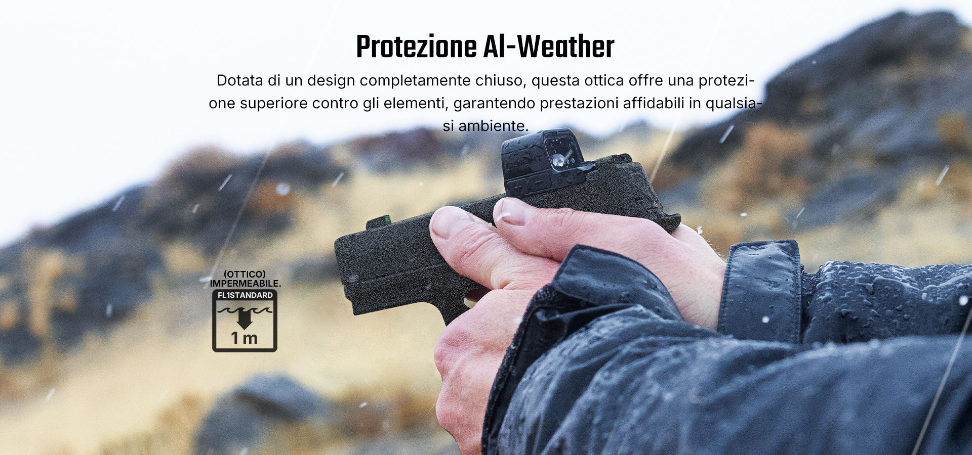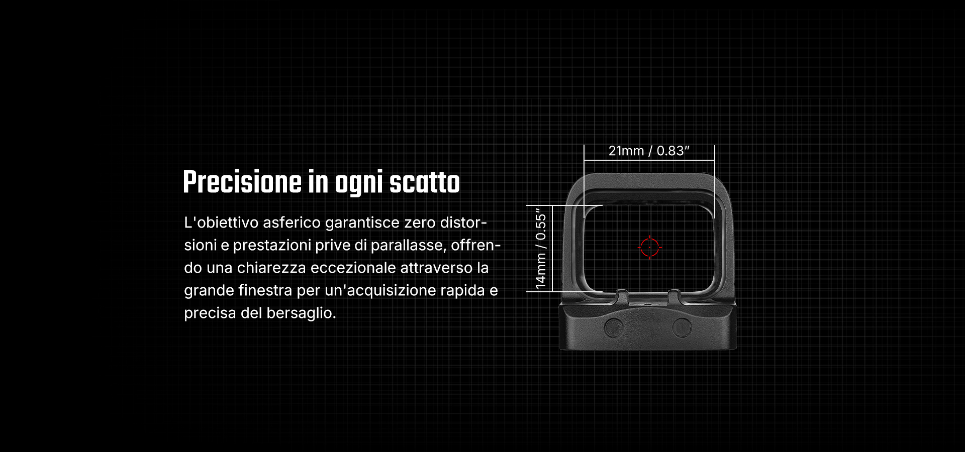 Cosa significa per te protezione e chiarezza senza pari? Con un sistema completamente sigillato e una lente asferica, Osight S garantisce zero distorsioni e prestazioni senza parallasse. Inoltre, con Osight S, non hai paura di polvere, pioggia e altri ambienti difficili.