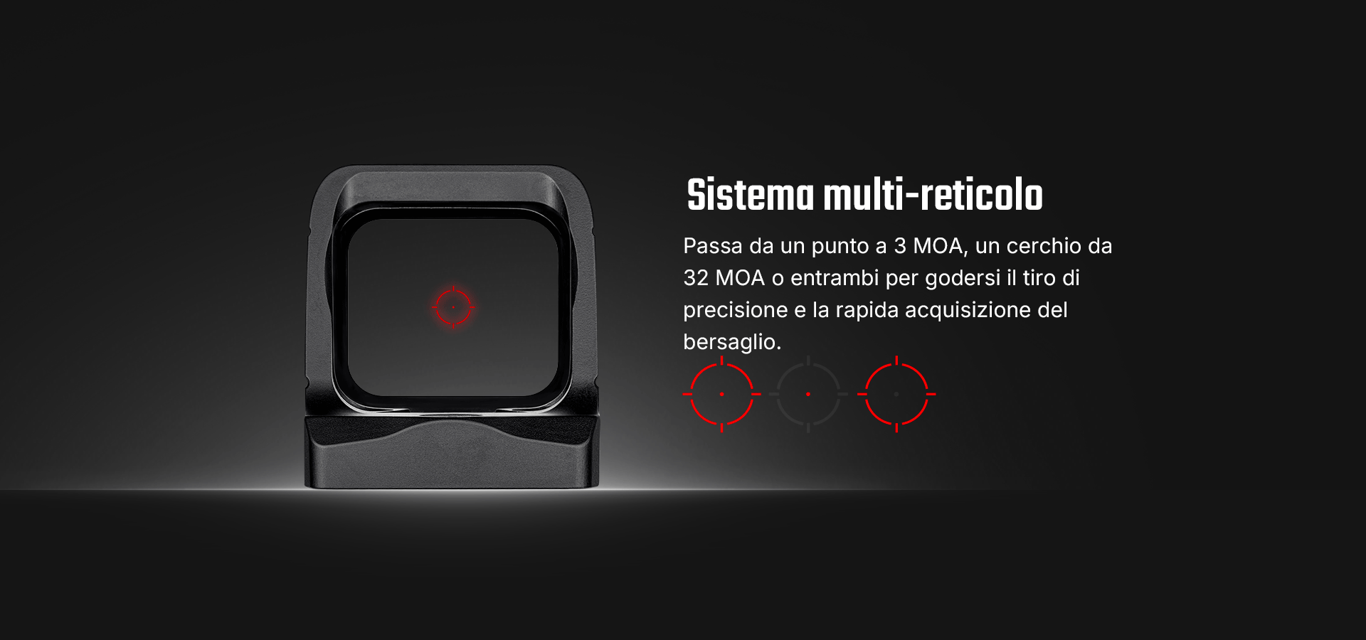 Cerchi precisione e versatilità? Con Osight X, puoi facilmente passare da reticoli a punto e cerchio, solo punto o solo cerchio in base alle tue esigenze. Il reticolo a punto e cerchio nitido e luminoso offre un'esperienza di mira di livello superiore, perfetta per qualsiasi situazione.