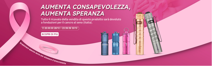 Olight si è impegnata a lanciare eventi di raccolta fondi online per la prevenzione e il trattamento del cancro al seno dal 2020. Con gli sforzi congiunti degli O-Fan di buon cuore, alla fine abbiamo raccolto $ 192.902 e $ 167.205 in tutto il mondo rispettivamente nel 2020 e nel 2021. Sempre più O-Fan hanno partecipato nel dare speranza alle persone colpite dalla malattia. All'inizio del 2022, Olight è stata premiata con La Lega Italiana per la Lotta contro i Tumori (LILT). Dimostrazione che stiamo contribuendo insieme in modo tangibile ad un futuro migliore per le persone malate.
