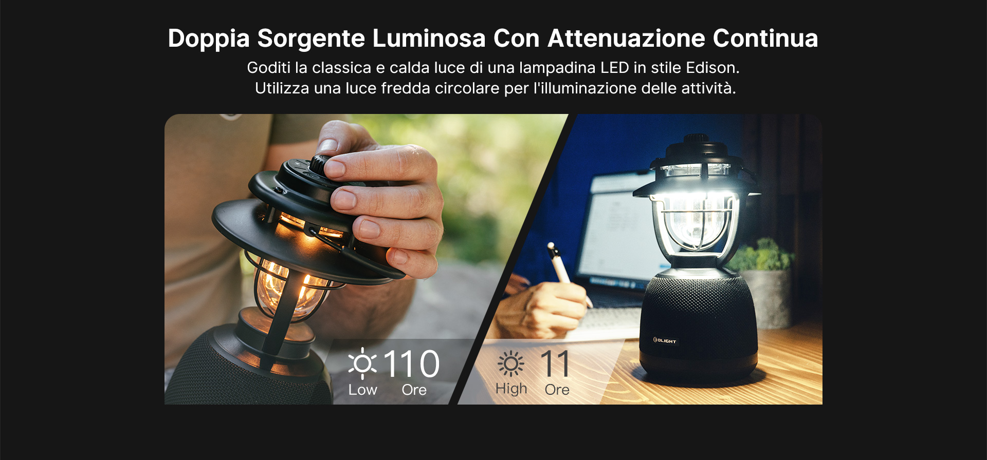 L'Olantern Music offre anche una regolazione continua dell'intensità luminosa, offrendoti un controllo completo sull'illuminazione. Da una luce calda e accogliente a una luce bianca brillante, questa lanterna si adatta all'atmosfera desiderata. Che tu stia leggendo vicino al fuoco del campeggio o abbia bisogno di una luce intensa per compiti all'aperto, l'Olantern Music è ciò che fa per te.