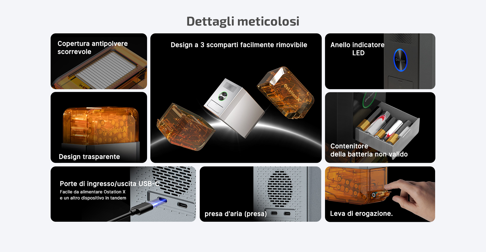 Combinando queste tre caratteristiche essenziali, Ostation X trasforma il disordine della ricarica tradizionale in un hub di alimentazione efficiente e autogestito, perfetto per case, banchi da lavoro o qualsiasi altro luogo in cui siano presenti dispositivi alimentati a batteria.