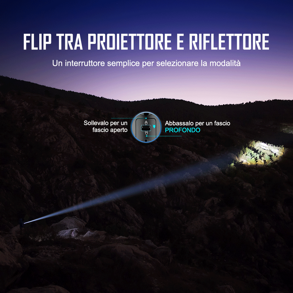 ● Doppio pulsante di alimentazione cooperativa: Un semplice interruttore a levetta per selezionare il faretto o il proiettore; un intuitivo interruttore a manopola per accendere la luce e scorrere tra i 7 livelli di uscita