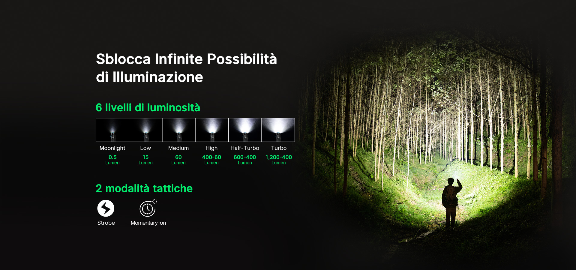 Con la Warrior Nano non si ottiene solo una luce, ma un ecosistema di illuminazione. Grazie all'interruttore laterale in metallo e all'interruttore tattico in coda della Warrior Nano, passare da una modalità di illuminazione all'altra diventa un gioco da ragazzi. È possibile entrare nel mondo della personalizzazione dell'illuminazione con sei diversi livelli di luminosità grazie all'interruttore laterale in metallo, dall'intensa modalità Turbo alla delicata modalità Moonlight per l'uso quotidiano.